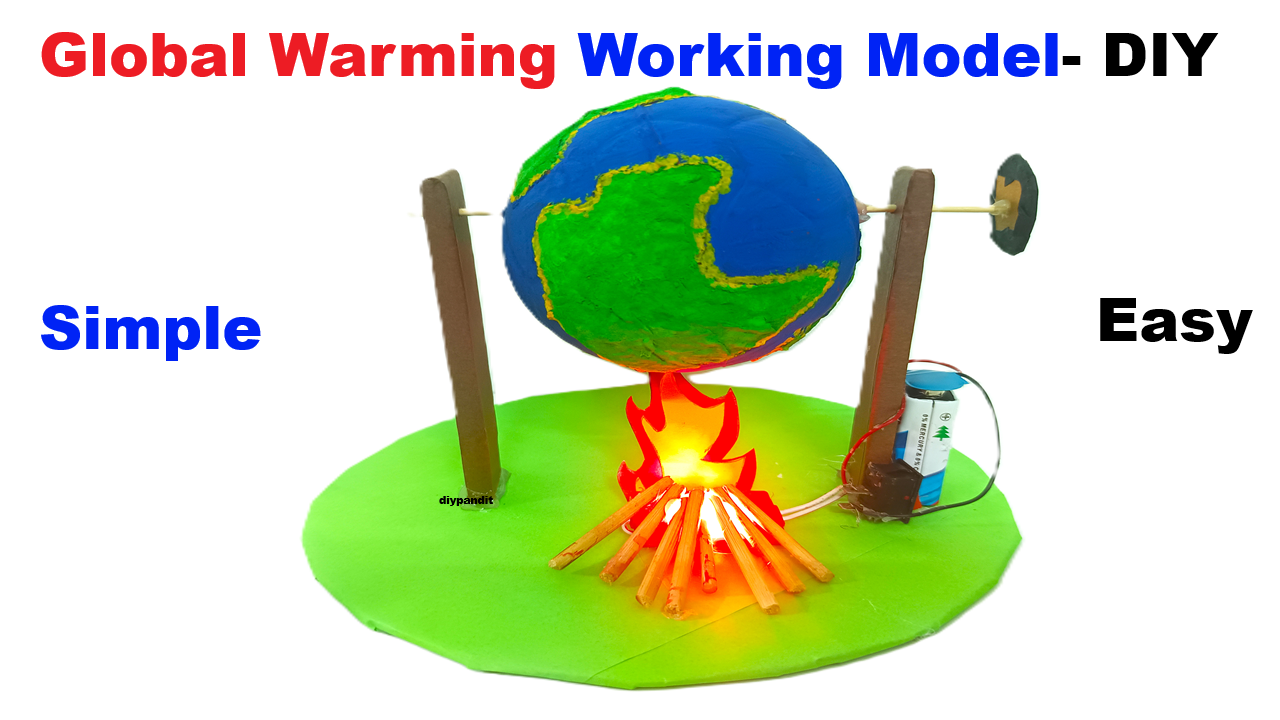 The rotating Earth represents our planet, and the LED lights + burning wooden sticks (or safe red LEDs) represent the rising heat and pollution from industries and deforestation.