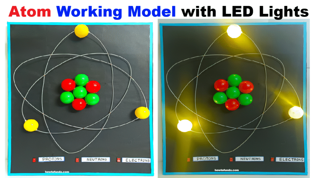 - Take 2–3 small plastic balls for neutrons (paint white, LED inside or keep plain).