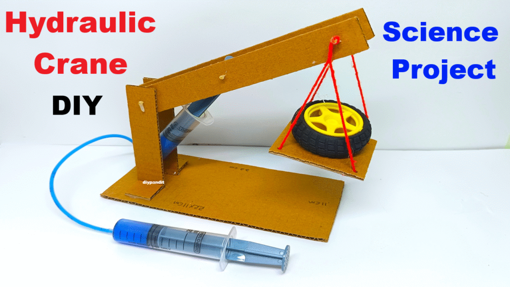 The hydraulic crane model demonstrates the principle of hydraulics and Pascal’s Law effectively.